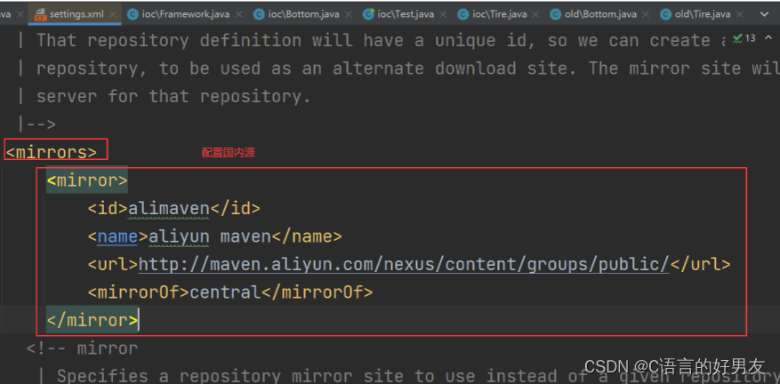 为什么要配置maven国内源呢?如果不配置可能导致创建Spring/Spring Boot失败,或者是在maven项目中引入jar失败,从而导致项目运行不起来。