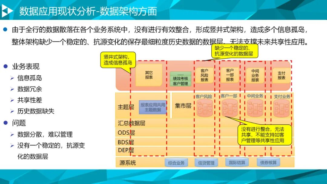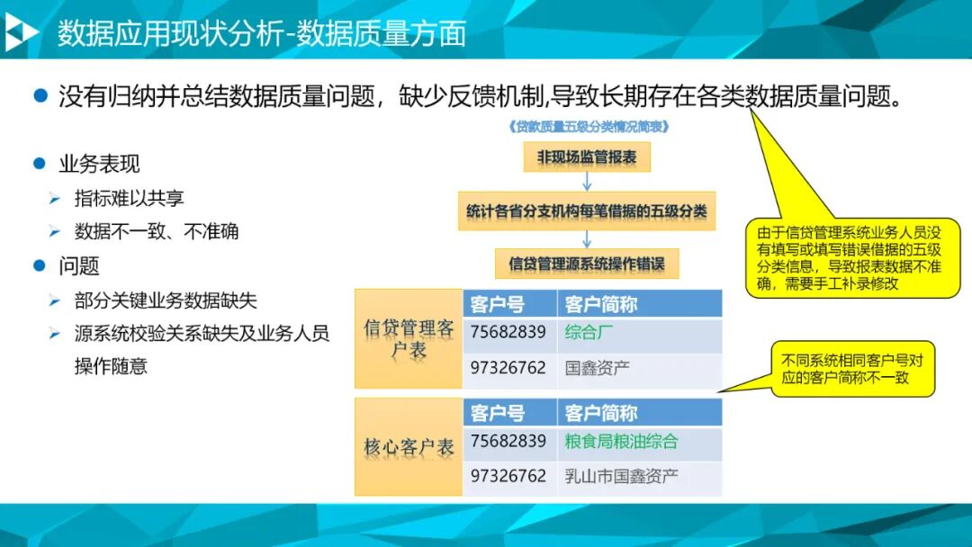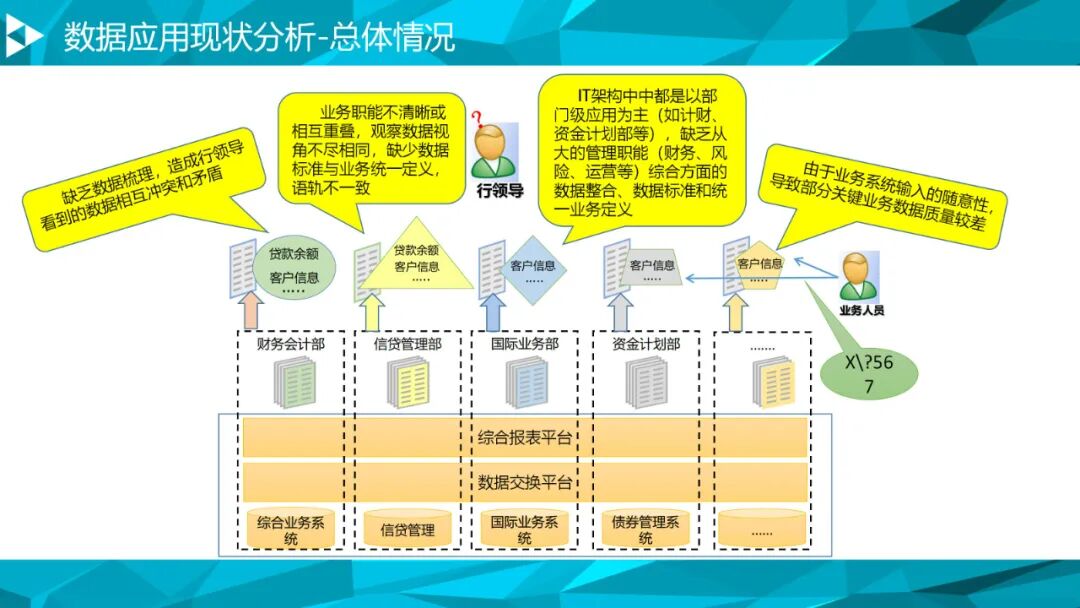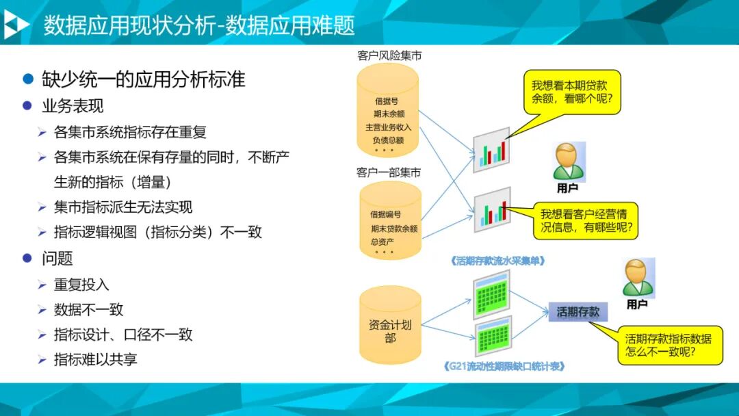 建立标准体系:定义全行统一的数据标准,包括基础标准(如客户、产品、机构编码)、指标标准(如业务指标口径)和技术标准(如模型、元数据标准)。