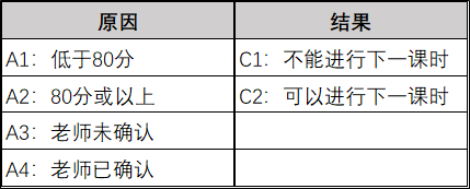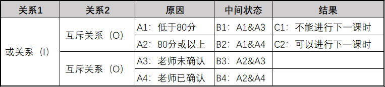 其次关于原因与结果,各个原因可以直达结果,或者分数与老师是否确认进行两两组合,形成中间状态,再到达结果。