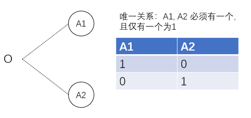 首先,原因与原因之间,关于分数,A1 与 A2 是互斥关系(O);关于老师是否确认,A3 与 A4 是互斥关系(O)。