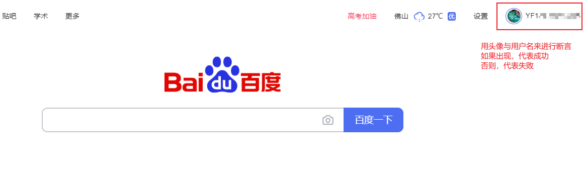 判断结果:将用例中的预期结果与实际结果进行比对,如果一致,代表成功,否则代表失败。对于这条测试用例,登陆成功的标志是,页面右上角出现了用户的头像与用户名,那么,可以通过获取网页中用户名的文本信息,与登录账户的用户名对比,一致的话,代表这条用例通过。