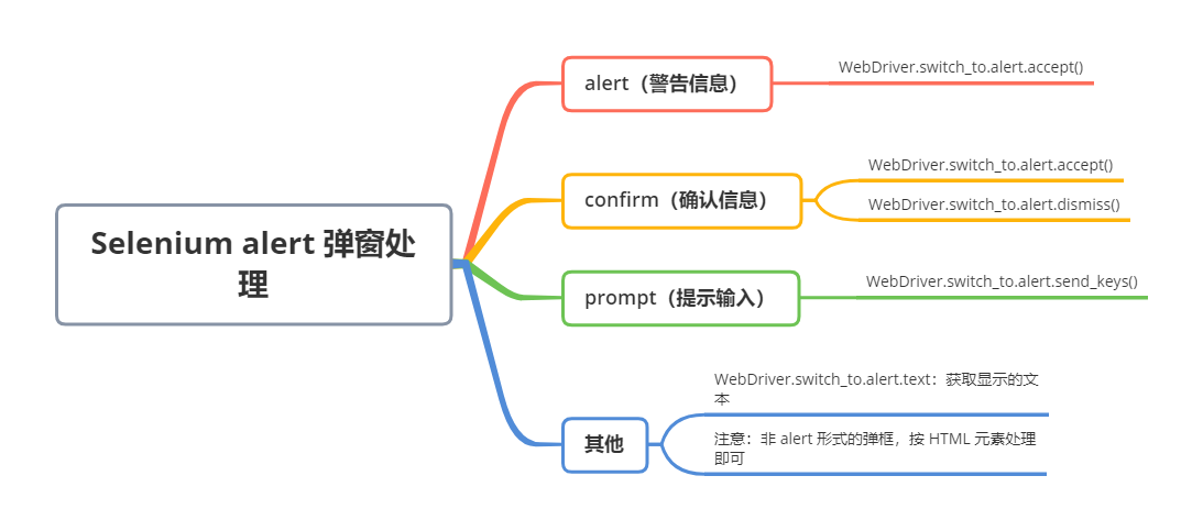 对于页面出现的 alert 弹窗,Selenium 提供如下方法: