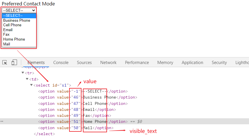 select_element.select_by_visible_text("Home Phone") # 根据文本选择