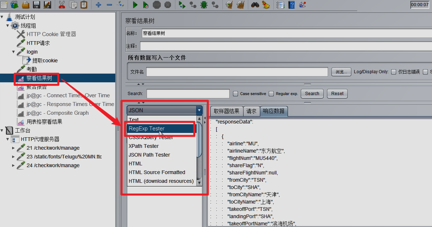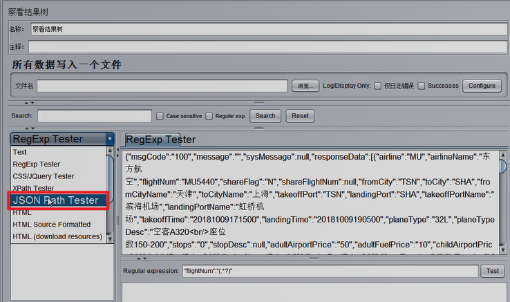 在查看结果树中,找到对应的请求,进入正则调试