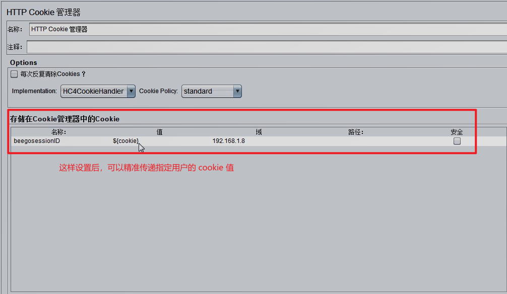 其次,可以通过 HTTP Cookie 管理器 精准传递指定用户的 cookie 值