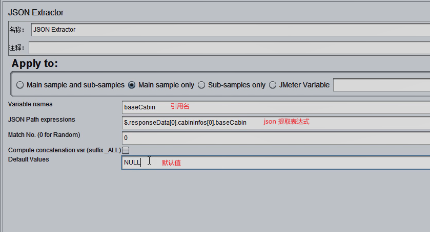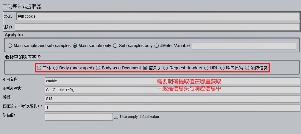 将调试无误的正则表达式,回填到 正则表达式提取器 中: