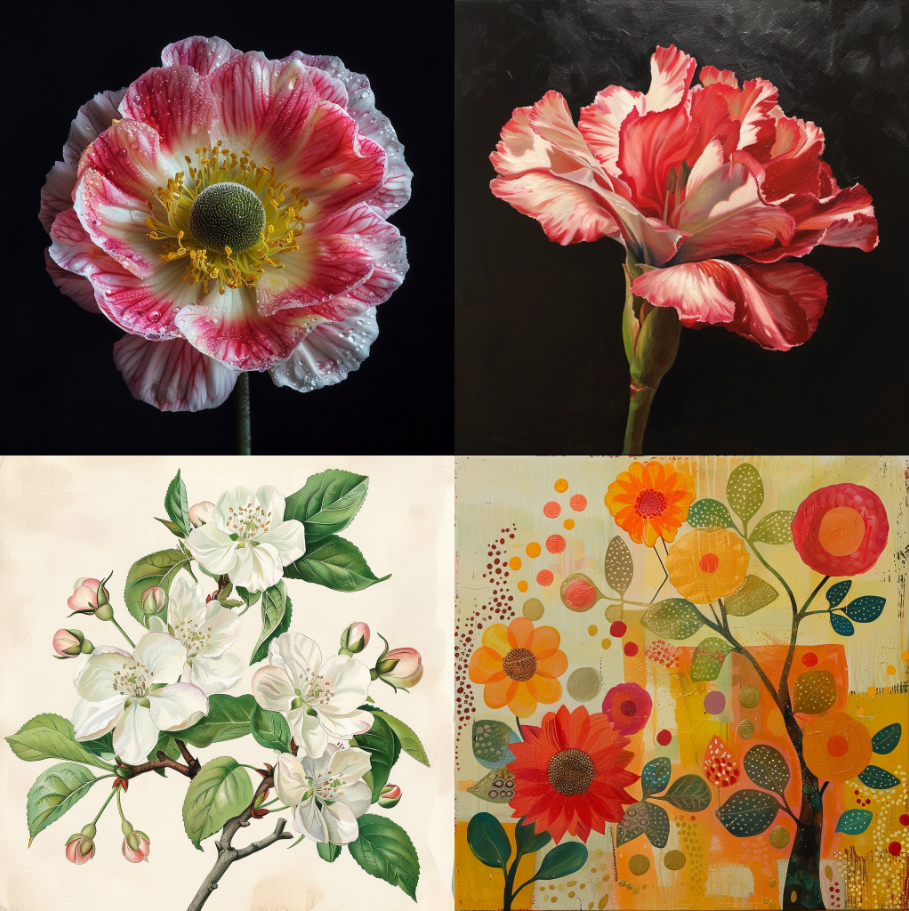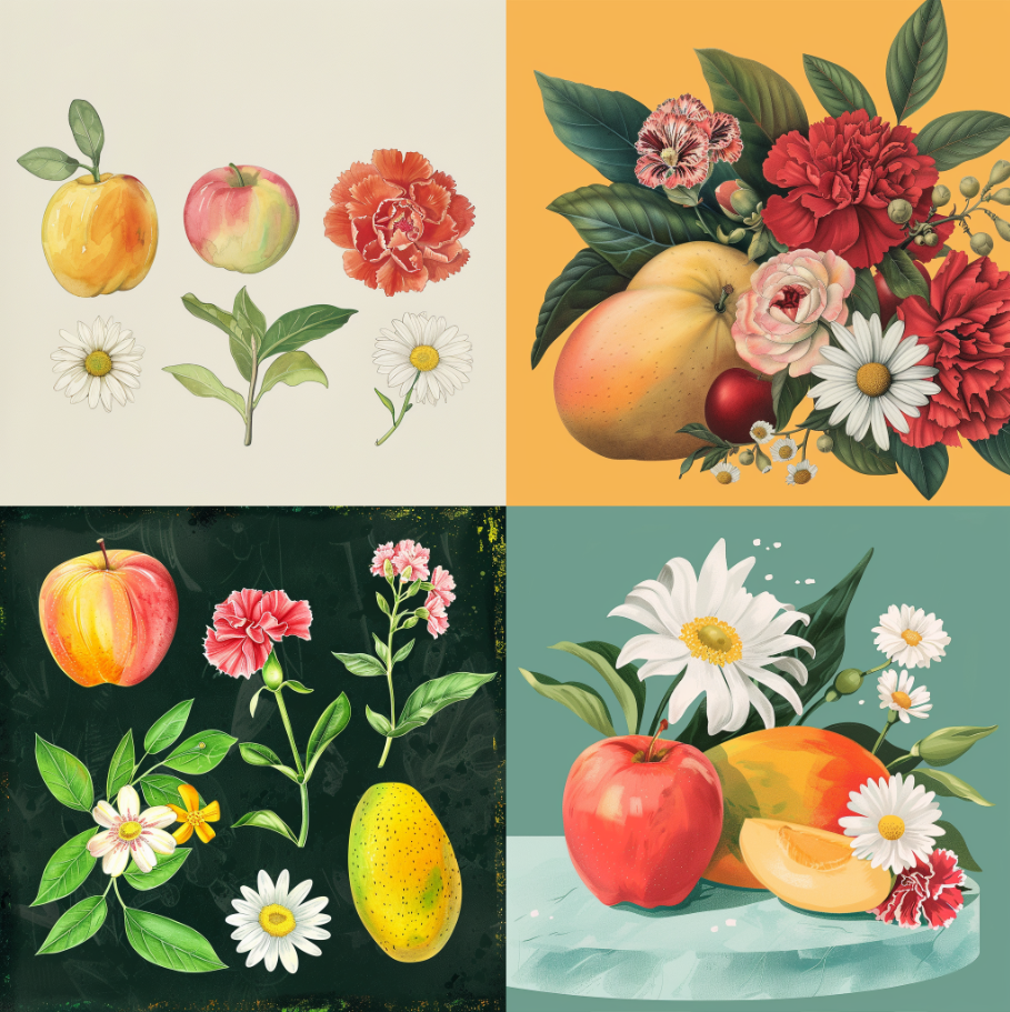 illustration, apple, mango, ::carnation::2, daisy --v 6