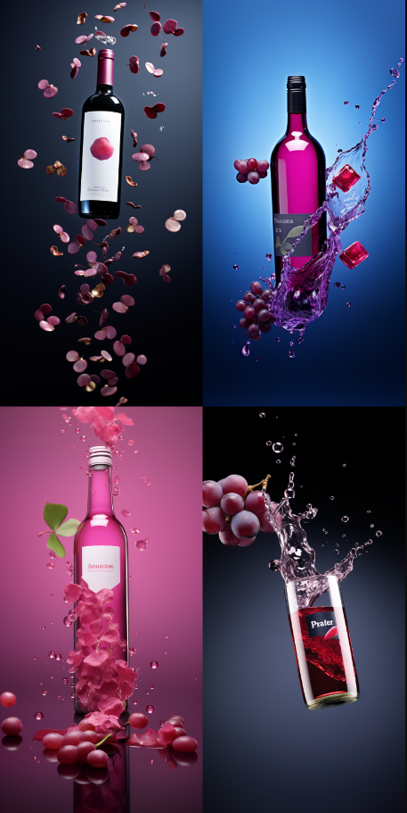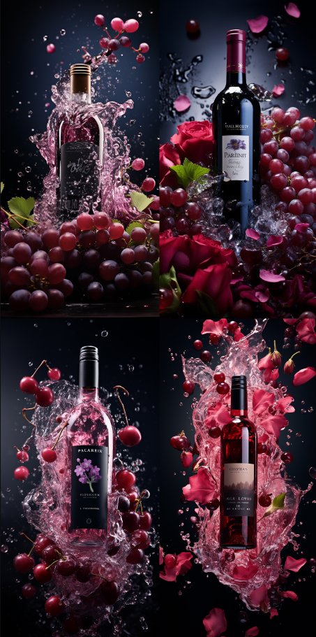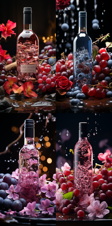 product film photography, advertising, blockbuster style, panorama, high Angle view, one bottles of wine, grape, Petals, water, water drops, cubes, clean background, depth of field --ar 1:2 --s 1000 --v 5.2
