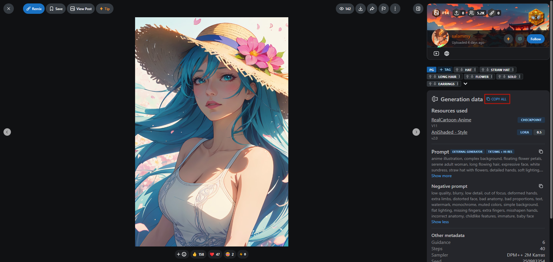 在C站中,一键复制生成图片的所有提示词与参数配置内容。