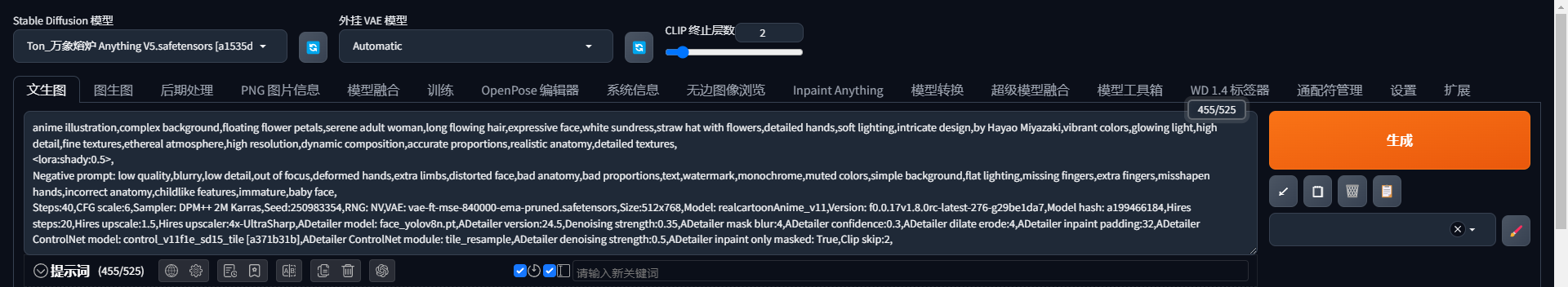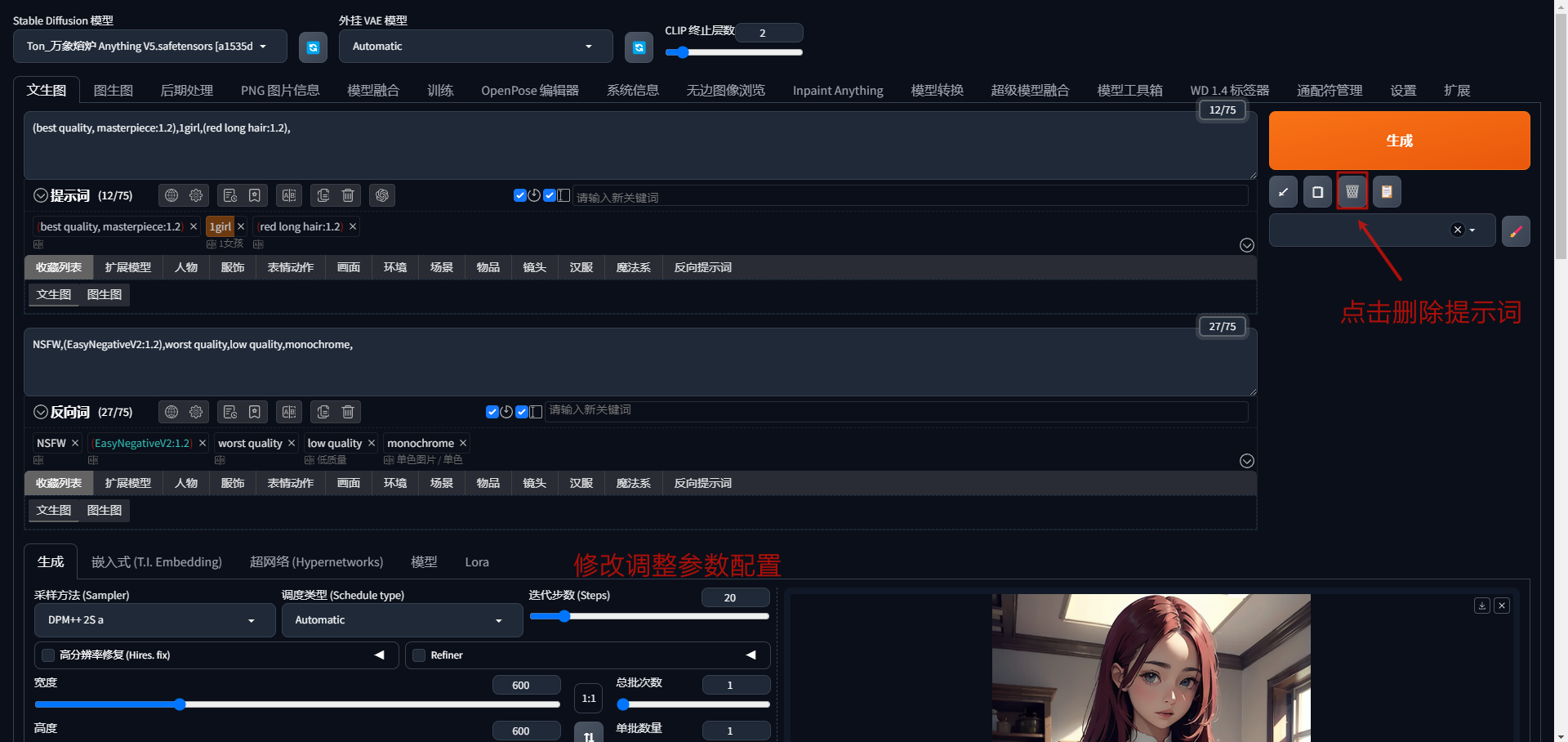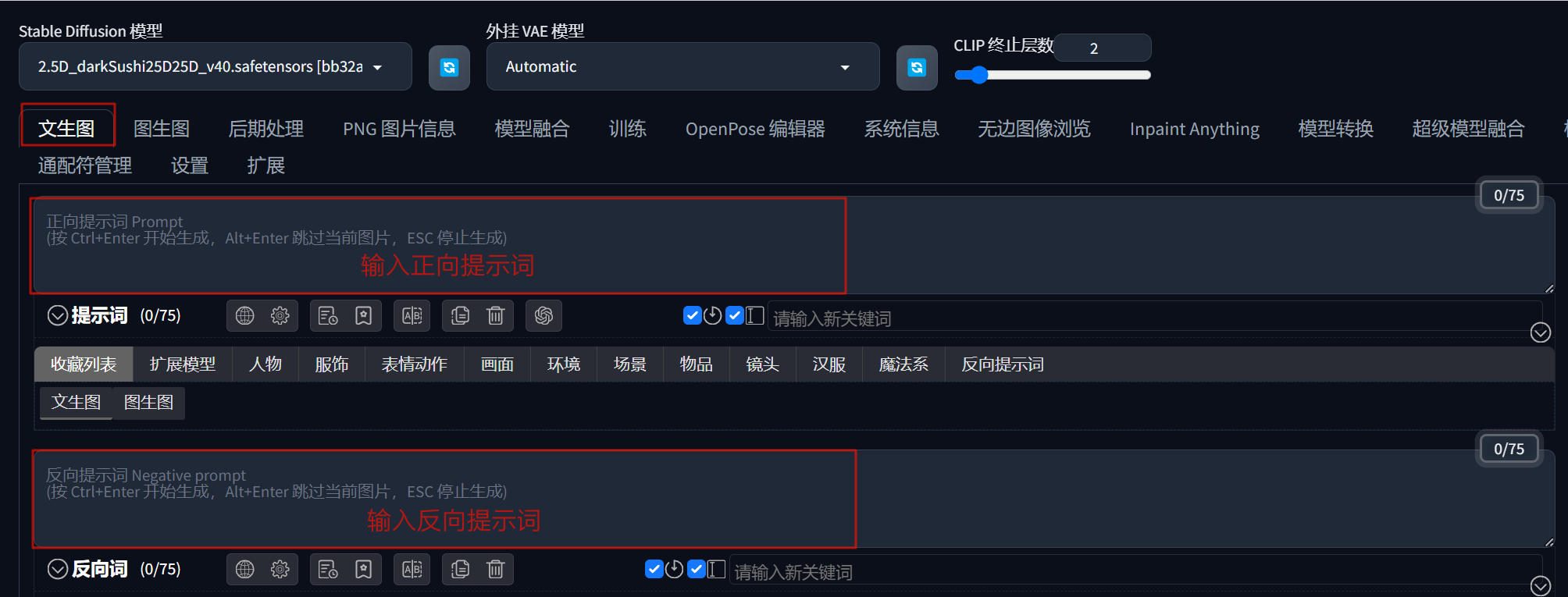 在 文生图 Tab中,下方两个输入框,分别输入 正向/反向提示词。