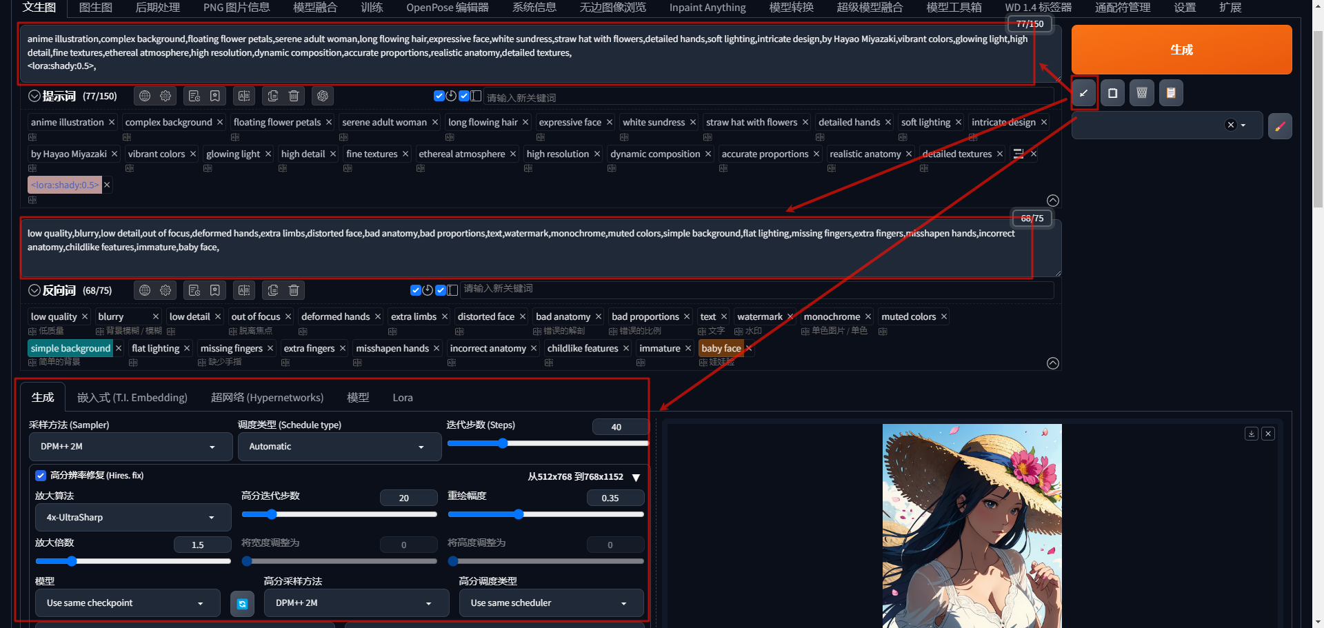 填写正反向提示词,设置 采用方法、调度类型、迭代步数、宽高等参数后,点击「生成」会得到一张图。