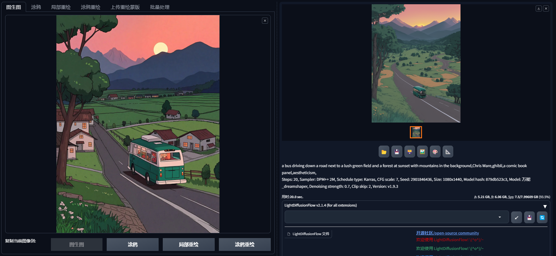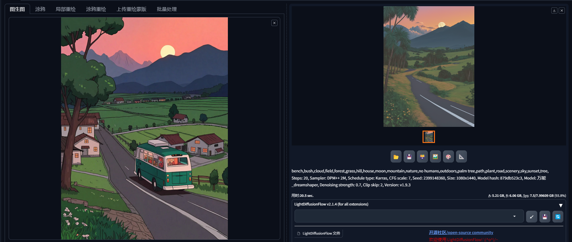 因为重绘幅度=0.7,所出图片与原图有差异,但整体的框架构图与颜色与原图类似。