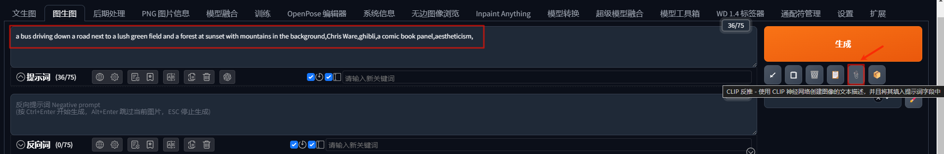 点击「CLIP反推」,根据图片生成一段自然语言描述的提示句子,该方式反推速度较慢。