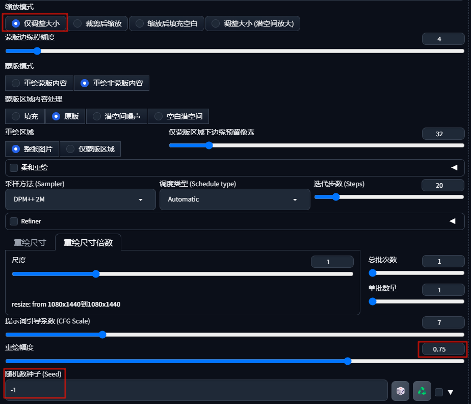 缩放模式选择「仅调整大小」,蒙版模式选择「重绘非蒙版内容」,增大重绘幅度=0.75,设置随机种子数=-1: