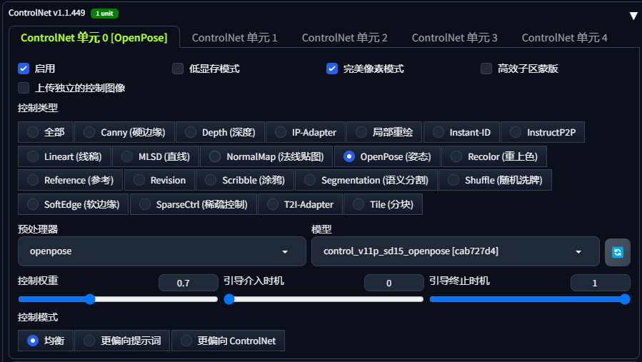 开启一个 ControlNet 单元,配置如下:
