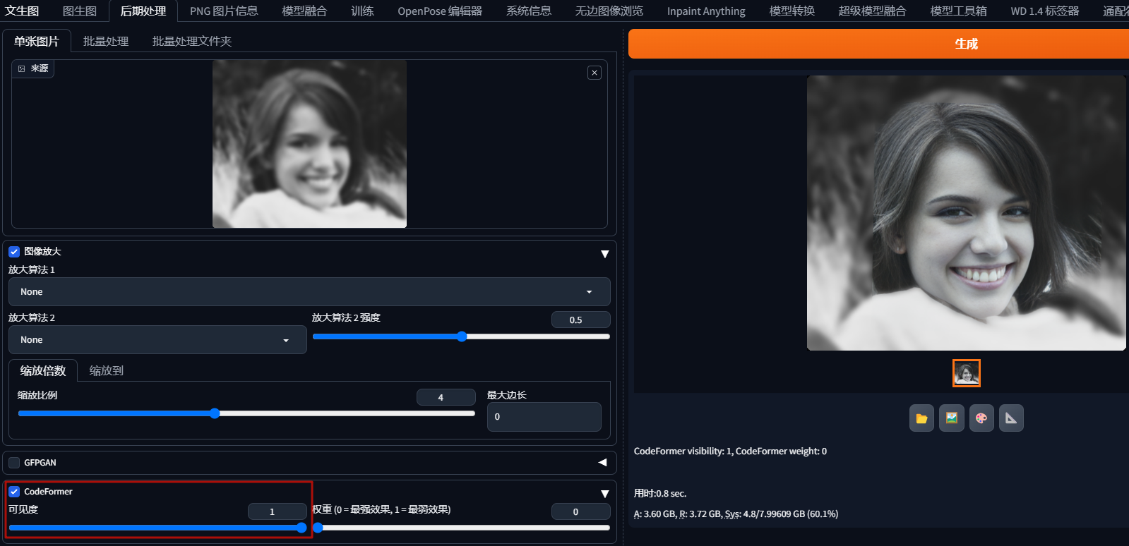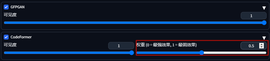 关闭 GFPGAN,勾选「CodeFormer」,将可见程度设置为1。