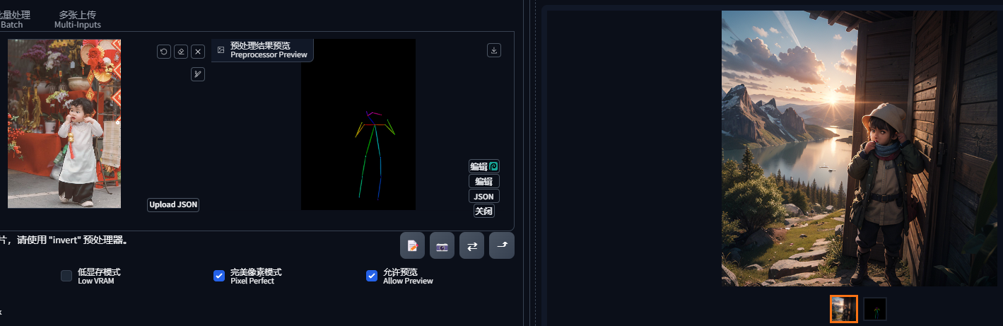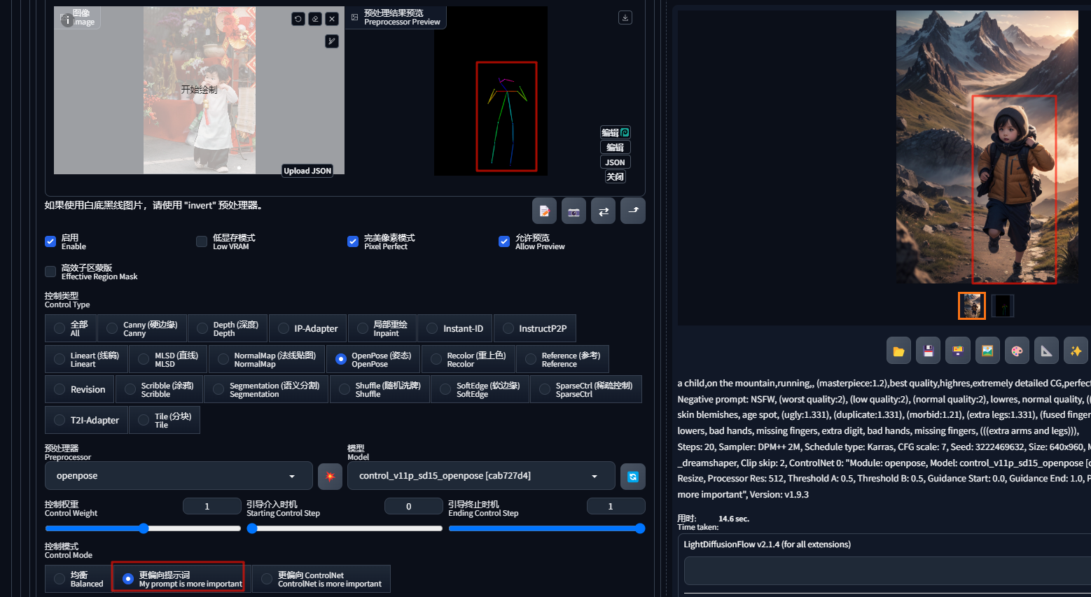 选择「更偏向提示词」,提示语:a child,on the mountain,running, 出图如下: