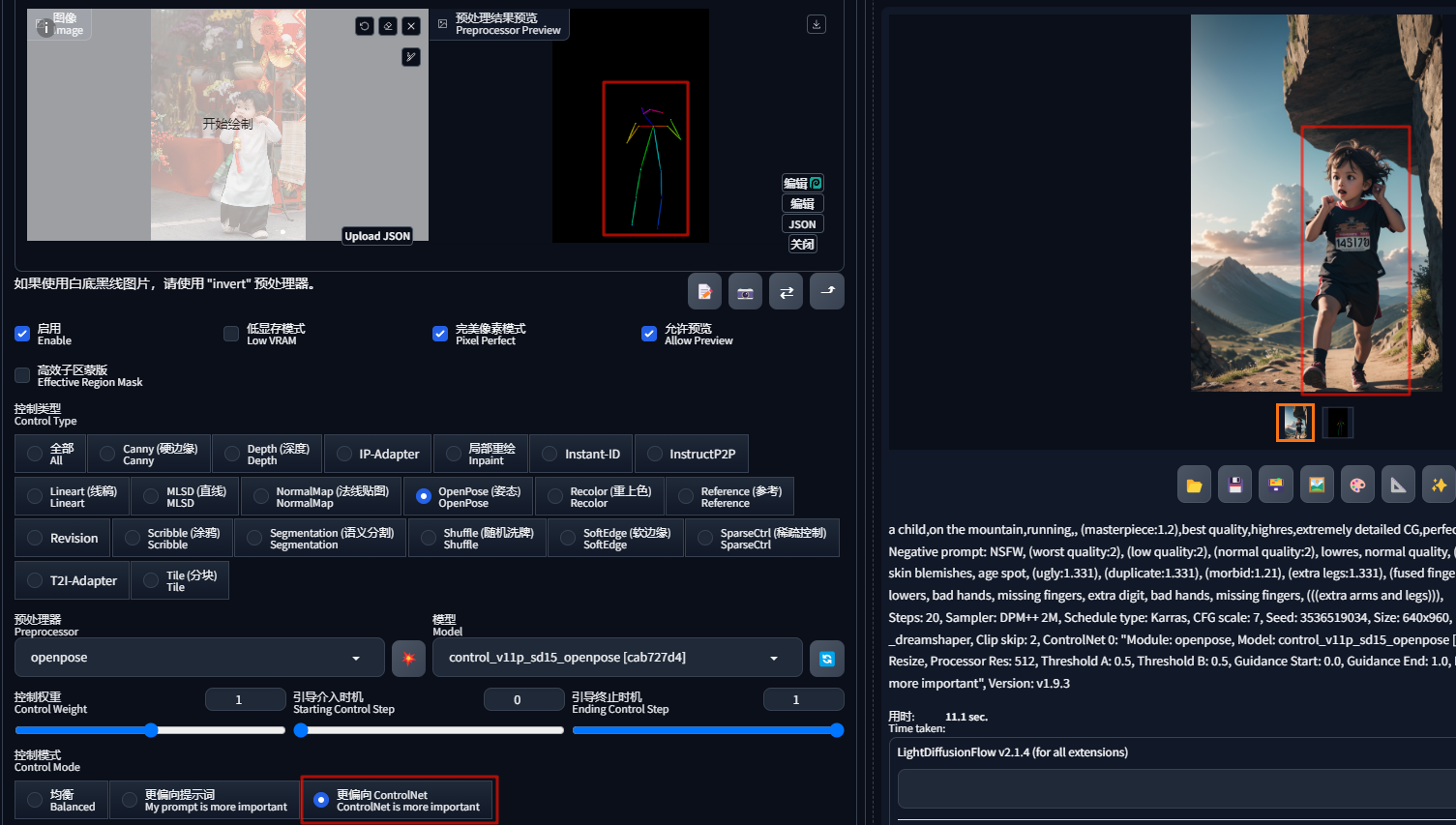 这次生成的图片,SD就基本不考虑 跑步 的提示词了,严格按照 ControlNet 获取的骨骼图姿势来生成图片。
