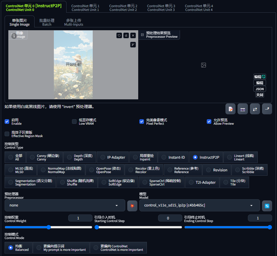 开启 ControlNet,上传一张图片,选择「InstructP2P」,其他保持默认: