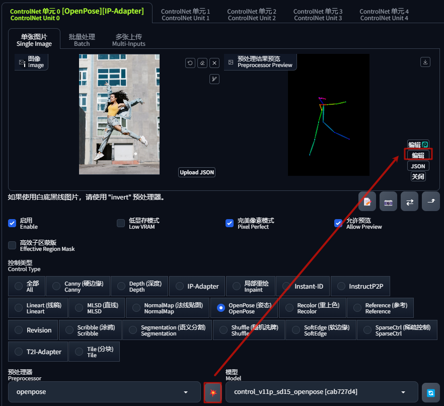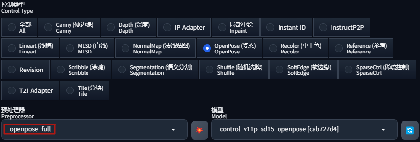 控制类型选择「OpenPose(姿态)」,预处理器、模型选择如下所示: