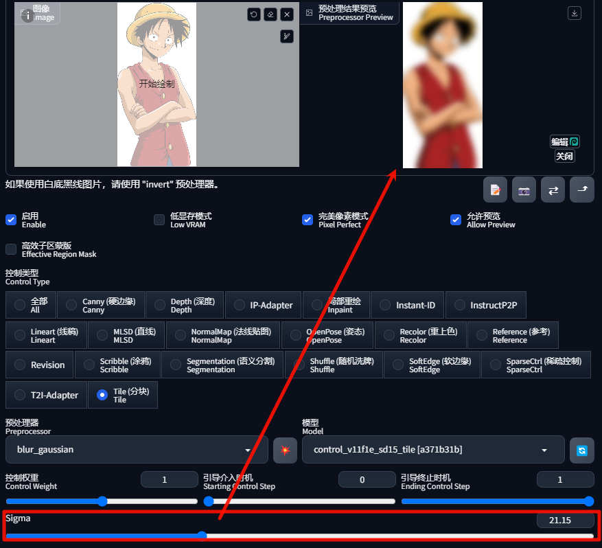 上传一张《海贼王》中,路飞的图片,开启 ControlNet,控制类型选择「Tile(分块)」,预处理器选择「blur_gaussian(高斯模糊)」: