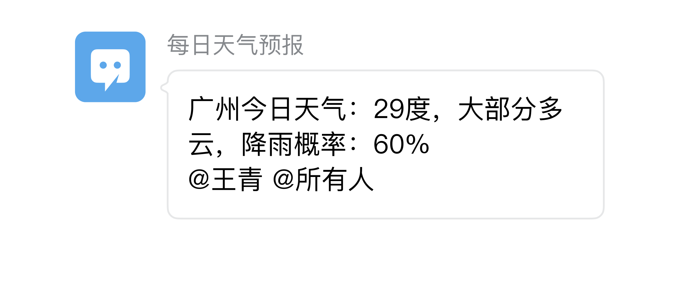 <span style="color:#2f9c0a">"content"</span><span style="background-color:rgba(255, 255, 255, 0.5)"><span style="color:#a67f59">:</span></span> <span style="color:#2f9c0a">"广州今日天气:29度,大部分多云,降雨概率:60%"</span><span style="color:#5f6364">,</span>