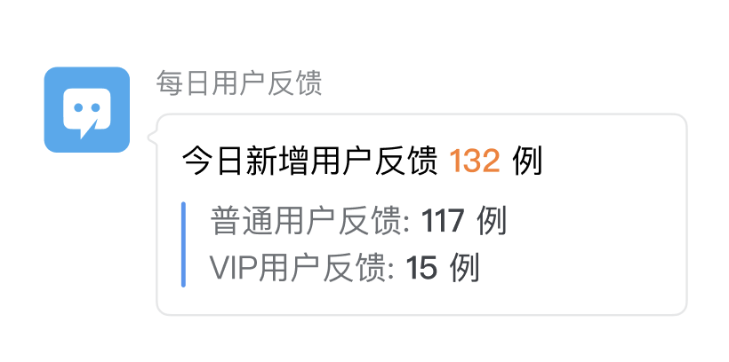"content": "实时新增用户反馈<font color=\"warning\">132例</font>,请相关同事注意。\n>类型:<font color=\"comment\">用户反馈</font>\n>普通用户反馈:<font color=\"comment\">117例</font>\n>VIP用户反馈:<font color=\"comment\">15例</font>"
