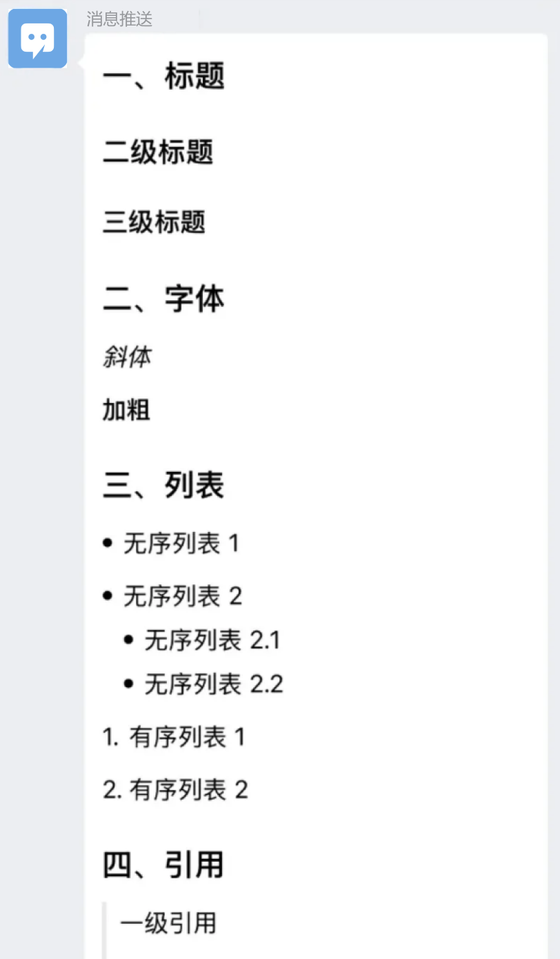 "content": "# 一、标题\n## 二级标题\n### 三级标题\n# 二、字体\n*斜体*\n\n**加粗**\n# 三、列表 \n- 无序列表 1 \n- 无序列表 2\n - 无序列表 2.1\n - 无序列表 2.2\n1. 有序列表 1\n2. 有序列表 2\n# 四、引用\n> 一级引用\n>>二级引用\n>>>三级引用\n# 五、链接\n[这是一个链接](https:work.weixin.qq.com\/api\/doc)\n\n# 六、分割线\n\n---\n# 七、代码\n`这是行内代码`\n```\n这是独立代码块\n```\n\n# 八、表格\n| 姓名 | 文化衫尺寸 | 收货地址 |\n| :----- | :----: | -------: |\n| 张三 | S | 广州 |\n| 李四 | L | 深圳 |\n"