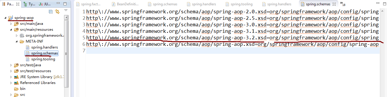从中可以看到http://www.springframework.org/schema/aop/spring-aop-3.2.xsd对应着一个路径,在这个路径我们可以找到对应的xsd文件,所以,在解析该标签的时候spring会更具schemas文件下面对应的路径去找这个校验文件,如果实在是没有找到的话它才回去网上下载然后再执行校验。