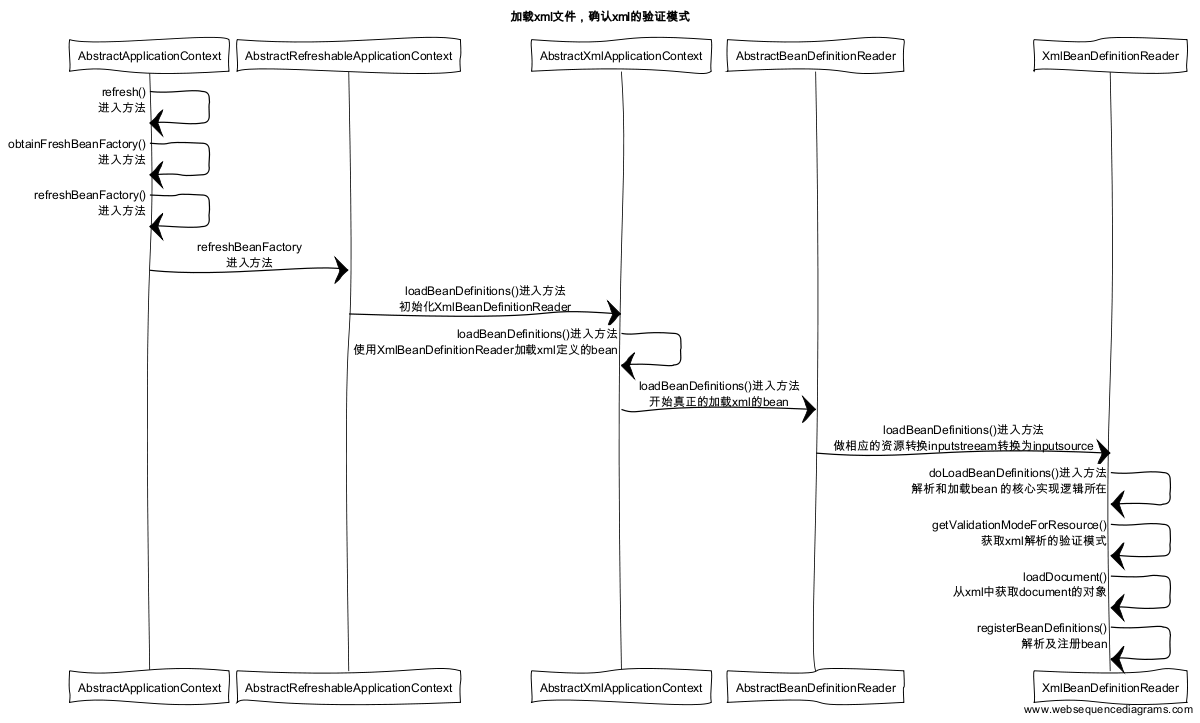 spring的配置文件已经写好了,spring启动的时候,它究竟是如何确定spring使用的是哪种xml验证模式呢,是DTD还是XSD,下面我们先通过时序图看看spring在判断验证模式的实现