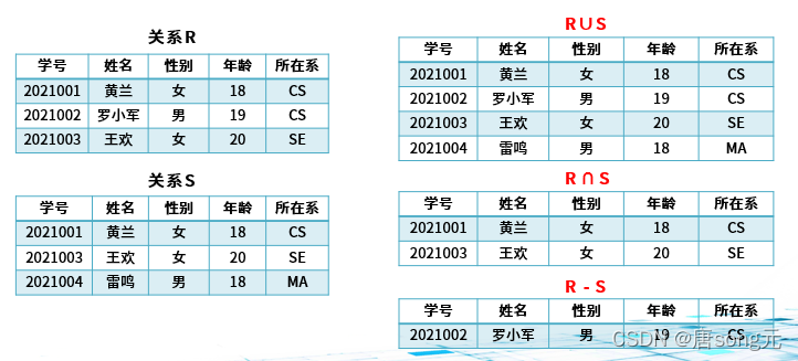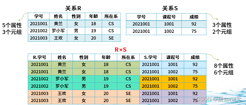 假设:关系R有r个属性,m个元组;关系S有s个属性,n个元组,则:R×S有r + s 个属性,有m × n 个元组