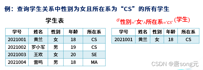 又称为限制(Restriction),它是在关系中选择满足给定条件的所有元组