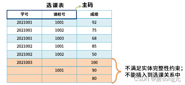 选课关系:(学号,课程号)是主码,学号是外码,取值参照了学生关系的主码“学号”的值;课程号也是外码,取值参照了课程关系的主码“课程号”的值