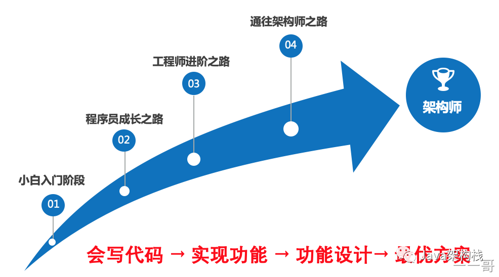 对于一个程序员来说,他的晋级路线可以分四个阶段:小白、码农、软件开发工程师、架构师。