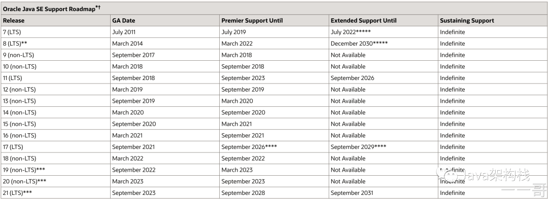 我们可以看看Oracle官方发布的JDK发布支持路线图: