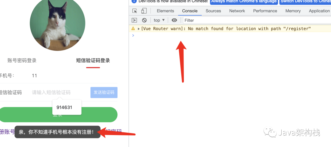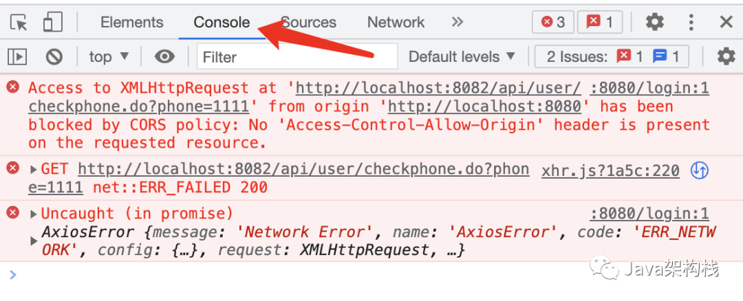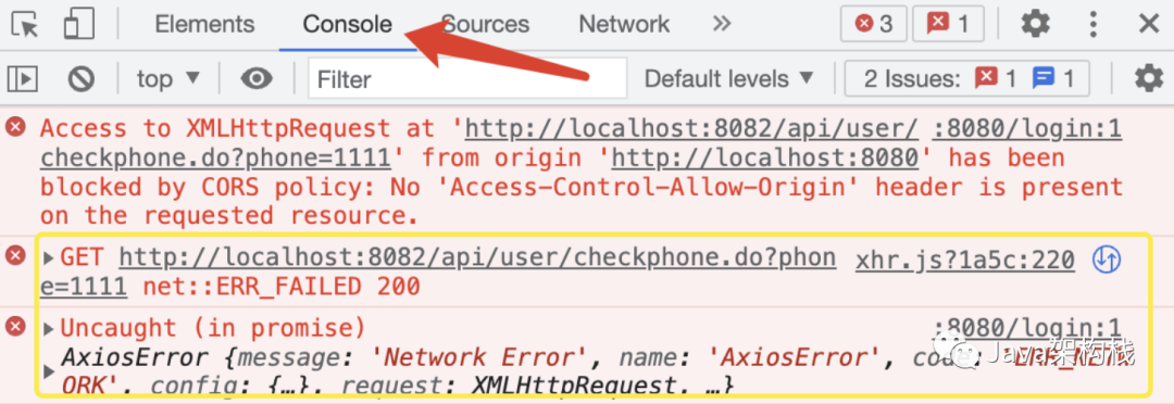 仔细分析上图的异常信息,我们可以发现,跨域问题是发生在请求checkphone接口时产生的。但我们打开后端项目的控制台,却发现后端接口并没有报错。