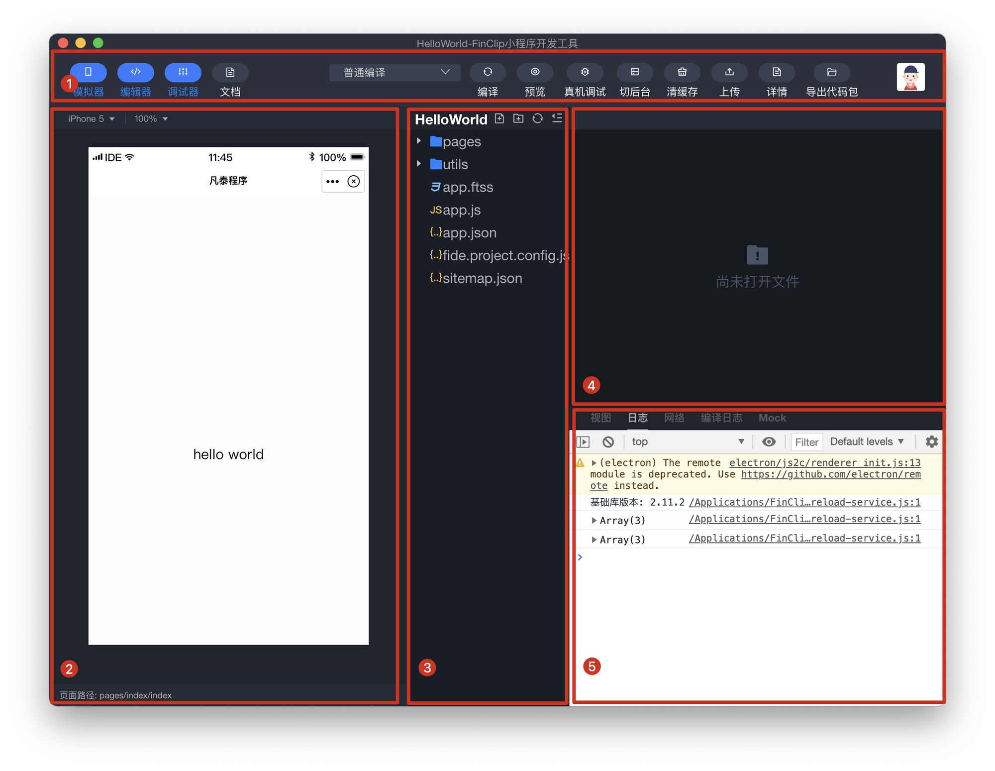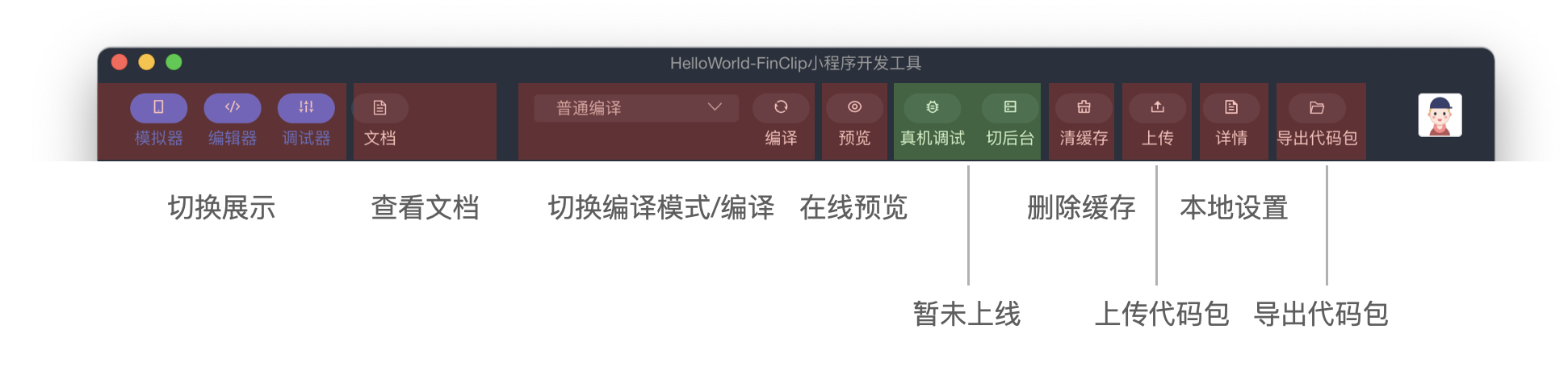 - 「真机调试」与「切后台」暂时还没有在 FIDE 中进行上线,前者的主要功能是让开发者在真机中调试小程序,所有的操作信息都会被传回 FIDE 中;后者则是模拟手机中的前后台切换操作(就像在 iPhone 中返回 HOME 页一样);