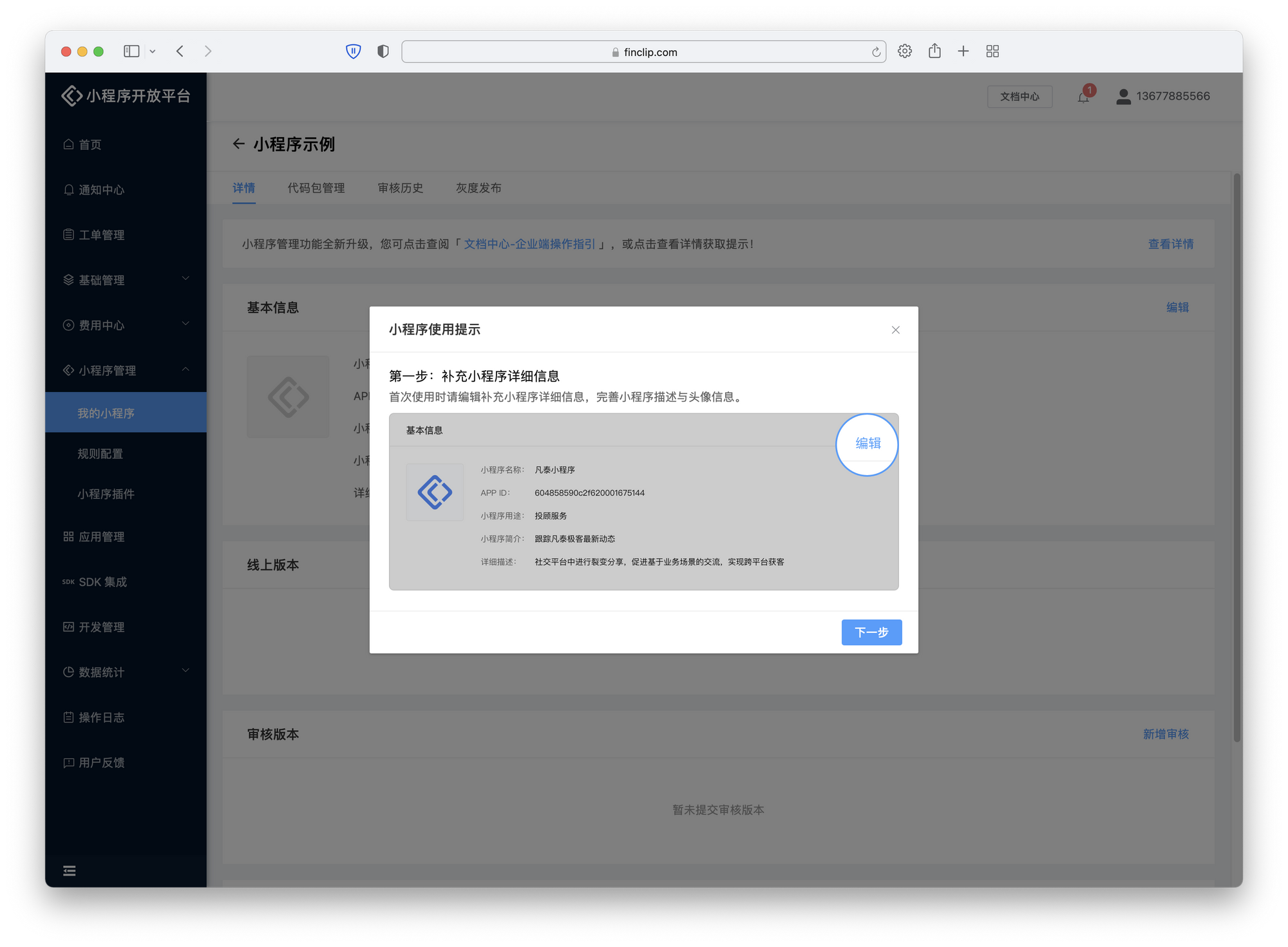 与常见的其他小程序平台不同,FinClip 支持一个用户账户下拥有多个小程序进行使用与体验(在 FinClip.com 中,体验版用户支持免费体验最多 99个小程序),因此我们需要先点击「管理后台-首页-小程序列表」中的「创建小程序」,在补充小程序的名称,用途与简介内容后,就可以完成小程序的创建了。