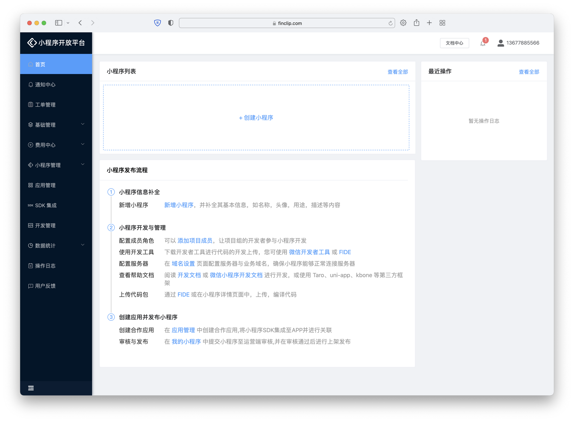 在完成账号注册后,系统会自动跳转到 FinClip 小程序开放平台的管理后台中。在管理后台中我们提供了许多与小程序,应用,安全相关的配置项,开发者可以根据自己的实际需要进行相关的配置。