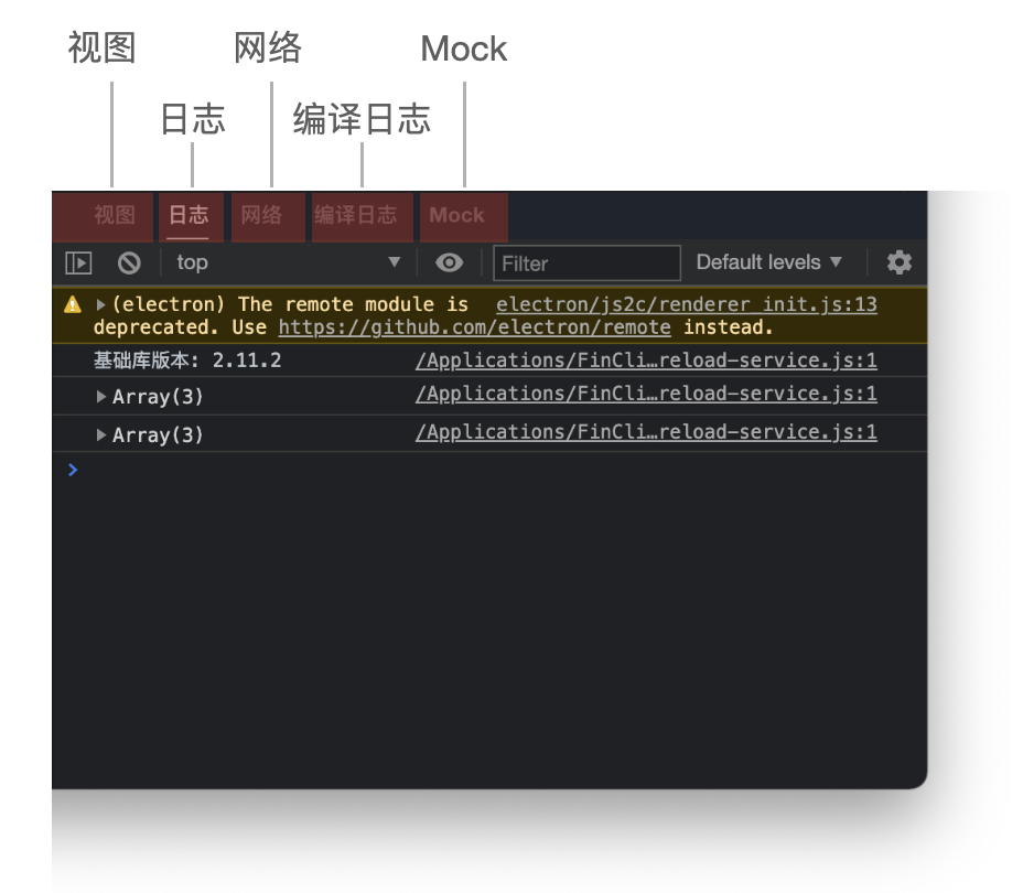- 「日志」视图是调试面板默认的视图,主要用于输出信息,我们在 JS 代码中使用 console.log(message) 所输出的 messag 就会显示在这个视图中,开发者也可以在这里输入并执行 JS 代码;
