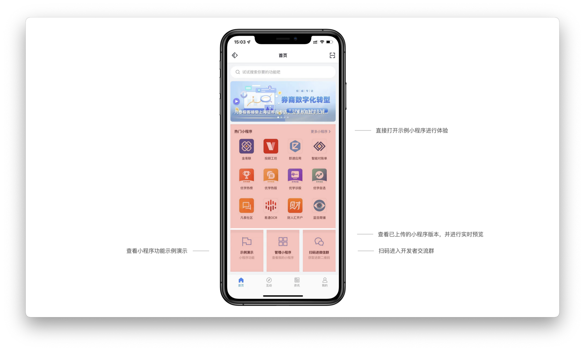当我们在应用商店中获取并下载「FinClip APP」到自己的手机后,会在登录后看到如上图所示的 4 个页面,分别为「首页」,「互动页」,「资讯页」与「我的」。