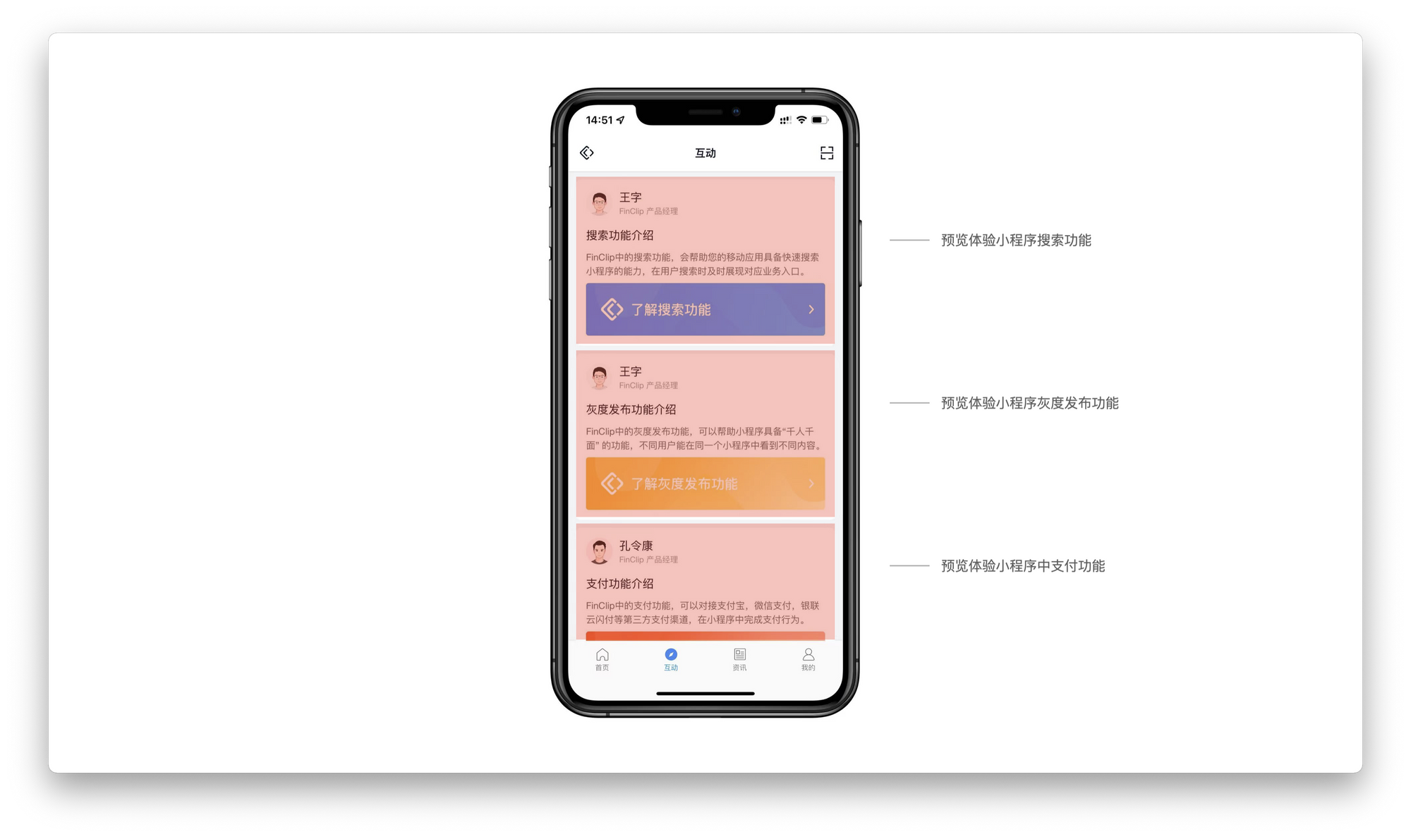 在「互动」页中,通过分别点击不同的卡片,将可以直接体验到「搜索能力/灰度发布/支付功能」等不同 FinClip 小程序中所特有的功能,帮您更进一步的了解 FinClip 小程序的相关特性与能力。
