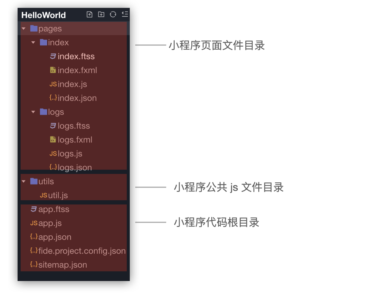 - ftss 文件类似我们常见的 CSS 文件,其实小程序的样式语言就是通过 CSS 进行编写的,只不过将 .css 的后缀变为了 .ftss 用以区分;