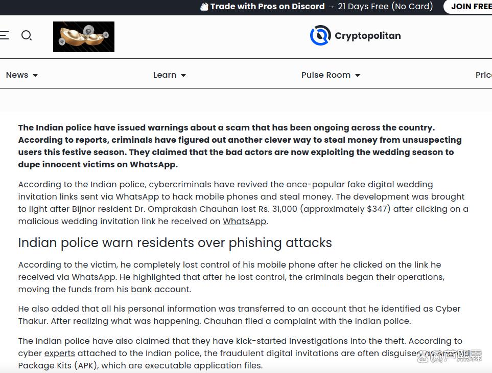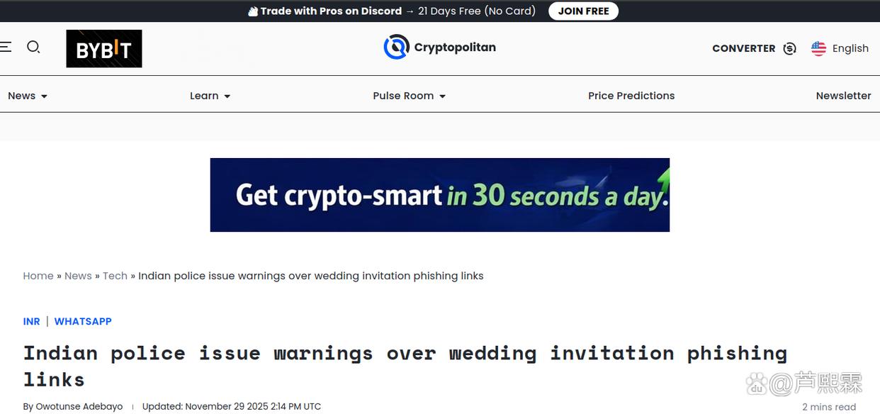 2025年11月,印度多个邦警方联合发布预警,指出一种新型钓鱼攻击正利用婚礼旺季(10月至次年2月)大规模传播。攻击者伪造包含新人照片、婚礼日程与场地地图的精美HTML页面,通过短信、WhatsApp或邮件发送附带短链接的邀请。一旦用户点击,即被重定向至仿冒的“RSVP确认页”或“婚礼相册下载页”,进而触发恶意JavaScript脚本或诱导安装伪装成“婚礼日程助手”的Android应用。