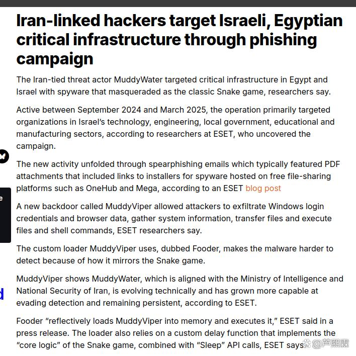 MuddyWater对以色列和埃及关键基础设施的钓鱼攻击,是一次典型的技术与社会工程融合的APT行动。其通过“贪吃蛇游戏”伪装、Fooder加载器反分析、MuddyViper多功能后门,构建了一条高效且隐蔽的攻击链。本文通过对攻击各环节的技术还原,揭示了当前防御体系的薄弱环节,并提出了涵盖策略、检测、响应与意识的综合对策。面对日益狡猾的国家级威胁行为体,防御方必须从被动响应转向主动狩猎,将威胁情报、行为分析与人因工程紧密结合,方能在攻防对抗中占据先机。