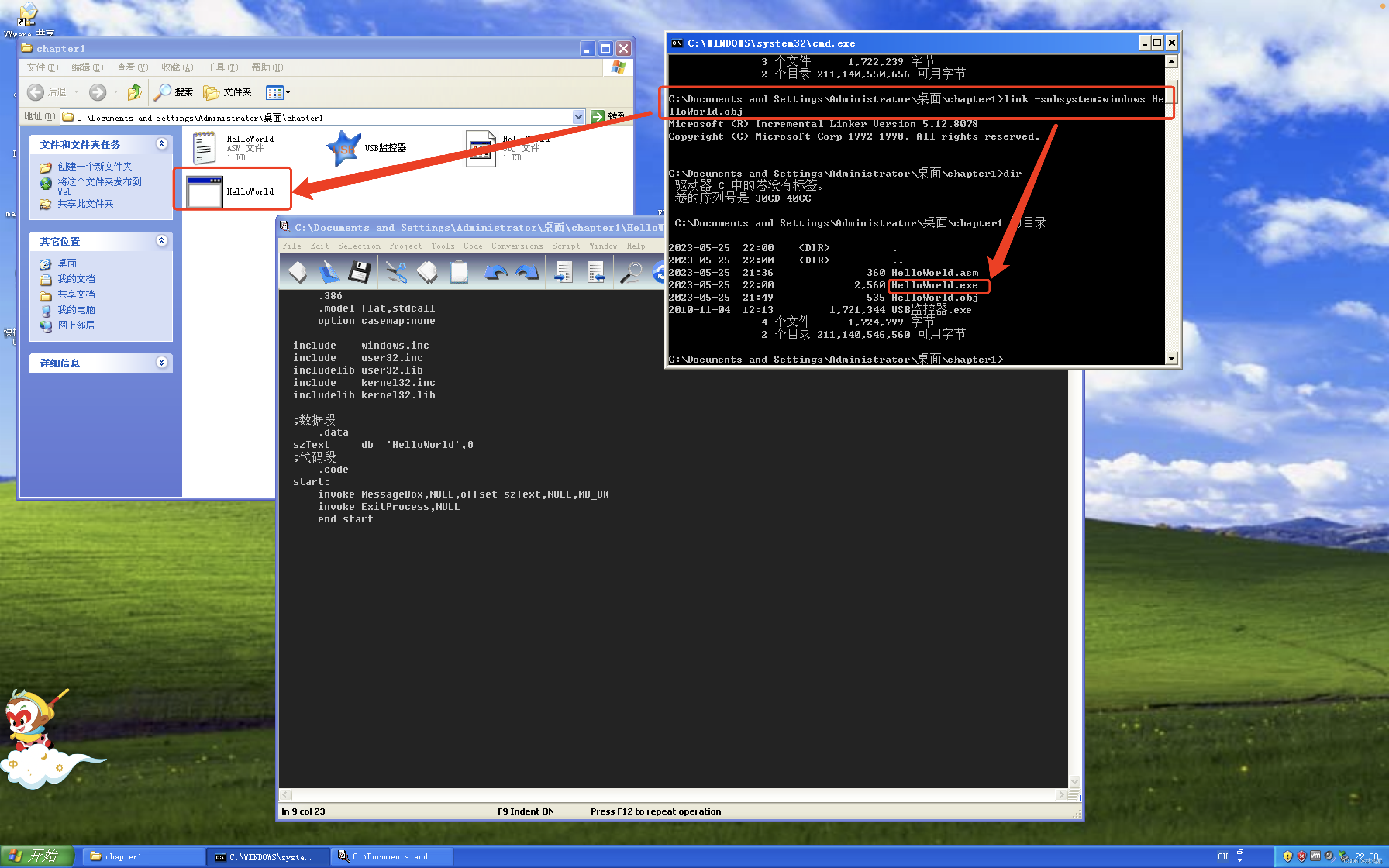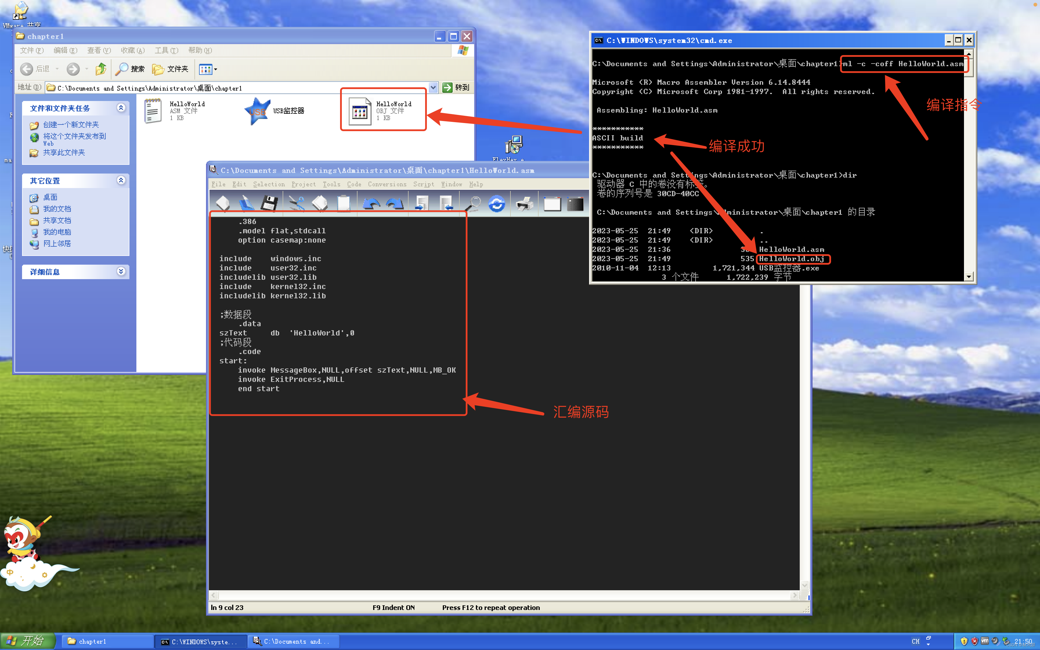 本文展示了如何将ASM源码编译为OBJ对象文件,然后链接成可执行的EXE文件。代码示例中,使用了stdcall调用约定,调用了WindowsAPI的MessageBox和ExitProcess函数,显示HelloWorld消息框并退出进程。