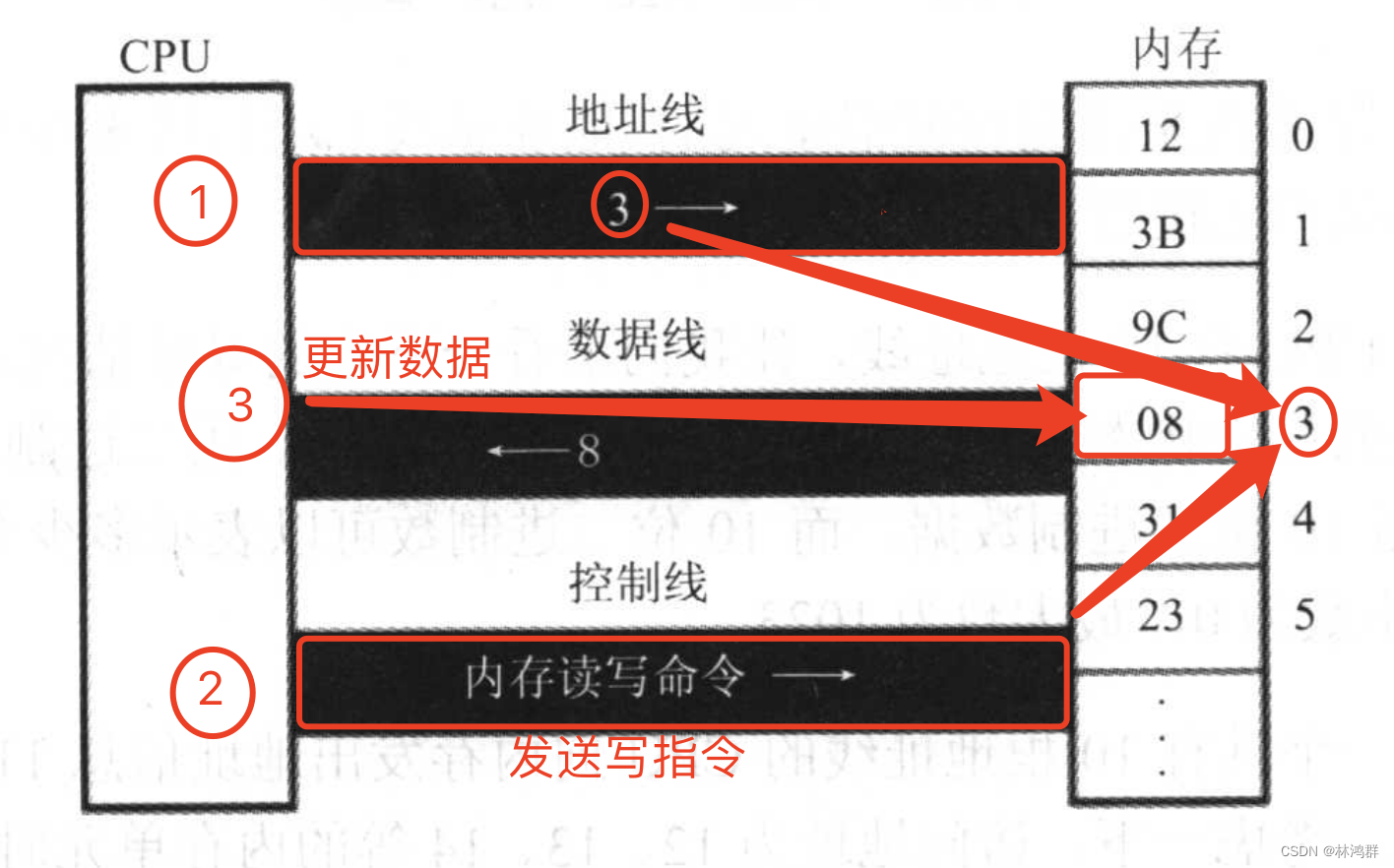 CPU通过总线写入存储单元中数据的过程:
