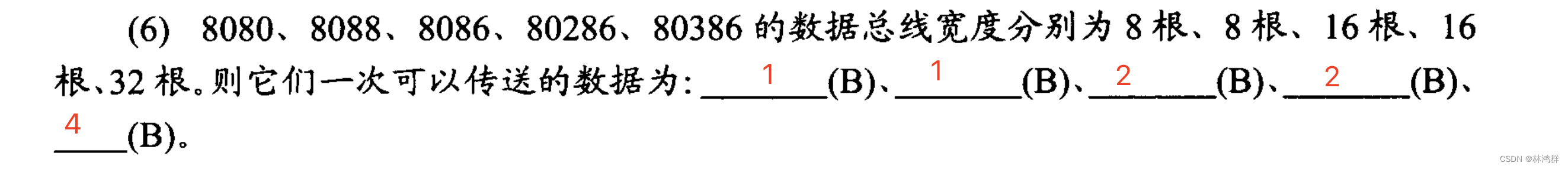 3.8088CPU数据总线宽度为8 , 8086CPU的数据总线宽度为16,所以这两个CPU在传输16bit数据时使用的时间与次数也不一样,前者要传输两次,后者只需要传输一次.