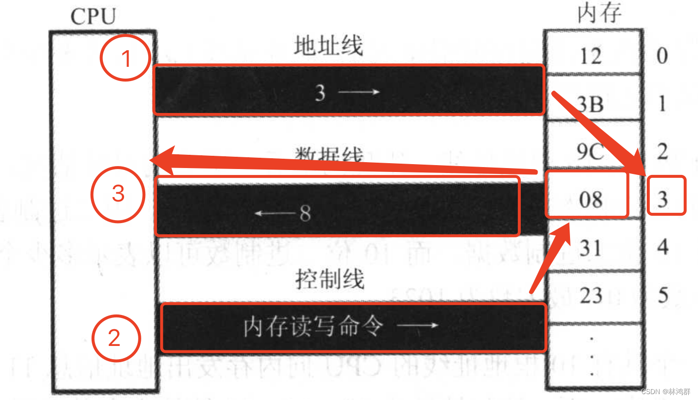 2.CPU通过控制线向内存发送要对存储单元编号 3的地址进行读数据操作