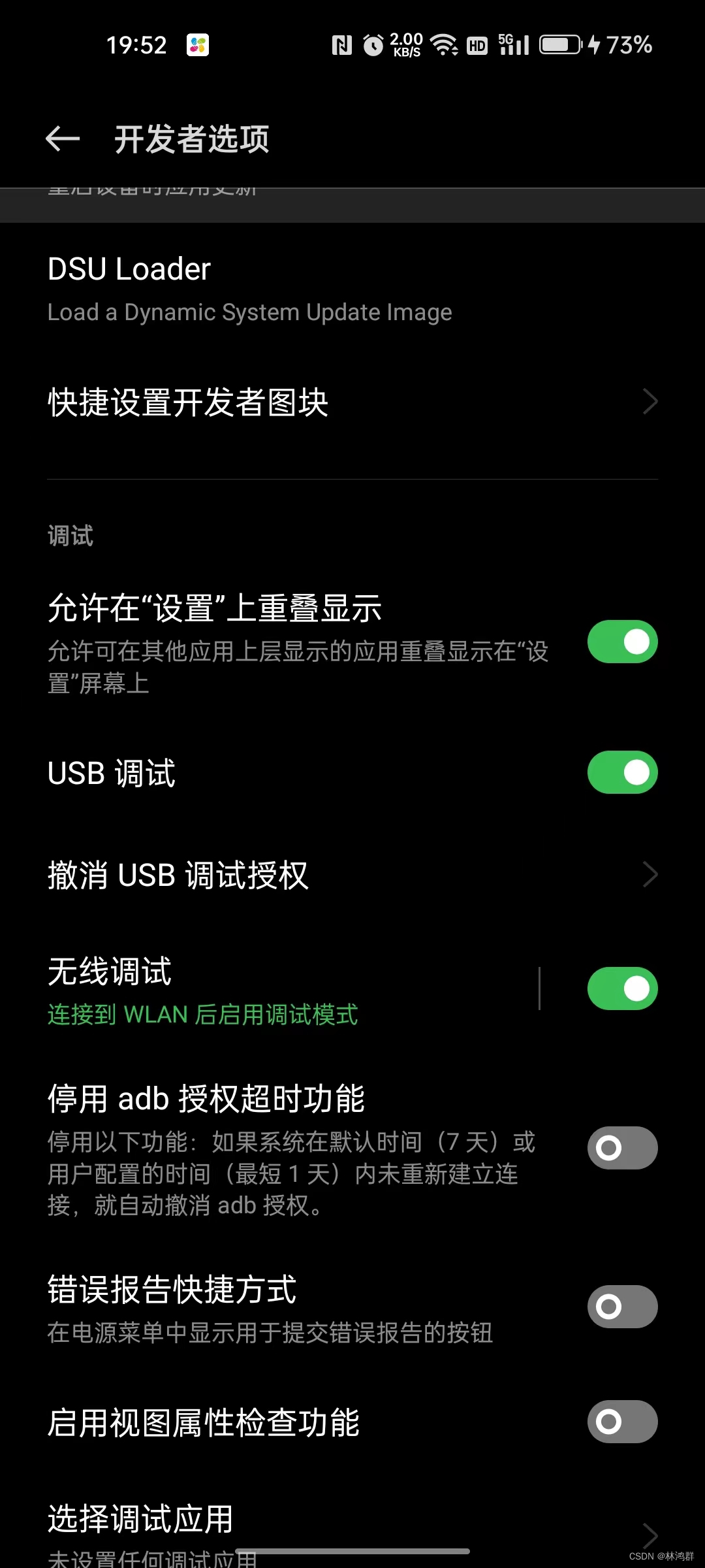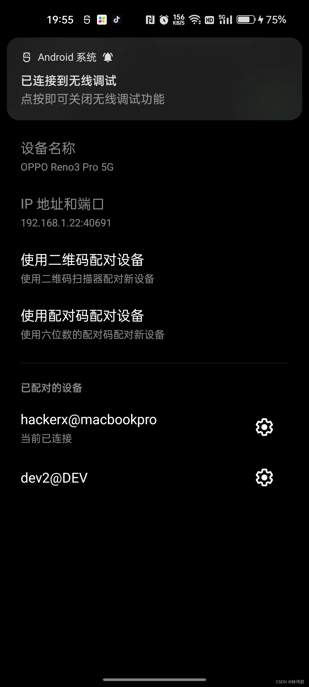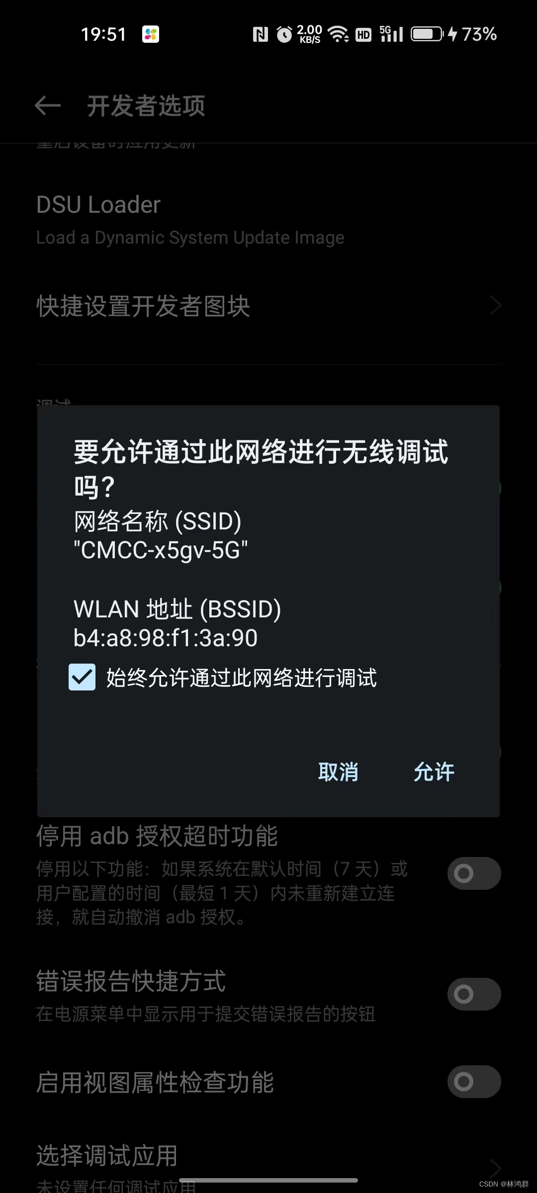 启用手机设置->开发者选项-无线调试,然后选择允许